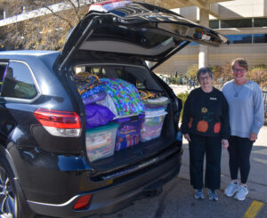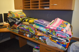 On November 14, 120 quilts found their way to the Radiation Oncology Clinic at University Hospital, each one a symbol of warmth and hope for children undergoing cancer treatment. These beautiful creations were hand-delivered by Polly Black, owner of Quilter’s General Store in Rockford, IL, along with her friend and fellow quilter, Denise Rehnberg.