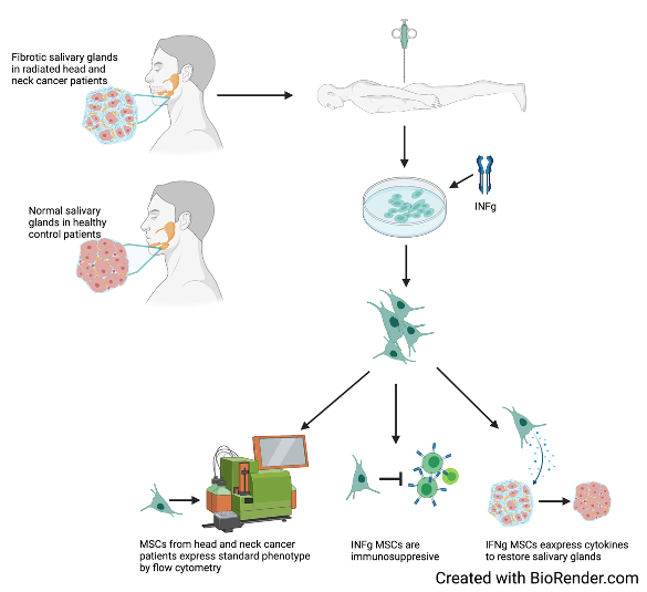 Radiation-induced xerostomia (RIX) represents one of the most common long-term side effects seen in patients who receive radiotherapy to the head and neck. Head and neck cancer (HNC) accounts for nearly 4% of cancers within the United States, estimates show that over 60,000 new cases with occur in 2021. Most HNC treatments include radiation therapy (RT), chemotherapy, targeted therapy, surgery, or a combination of treatments. RT is a primary treatment modality in HNC, while effective in treating cancer, RT causes auxiliary damage to surrounding normal tissues. Xerostomia is a subjective condition of dry mouth hallmarked by decreased saliva production and/or alterations in the composition of saliva. Radiation impairs the saliva-producing acinar cells along with inducing functional changes in the salivary gland ultimately leading to xerostomia. RIX adversely affects quality of life in patients, aside from the general discomfort of dry mouth, patients experience increased dental carries, alterations in taste, fissures in and around the mouth, difficulty swallowing, chewing, and speaking. Currently, there are no available treatment options that address the causes of xerostomia, existing options for patients suffering from RIX are either palliative or accompanied by harsh side effects. There is a critical need to develop safe and effective therapies for RIX. Emerging preclinical and clinical research suggests administration of mesenchymal stromal cells (MSC) to the radiation-damaged salivary gland can lead to increased saliva production and rescue of glandular structures. While it has been demonstrated that MSCs benefit the radiation-damaged salivary gland there is little showing the mechanisms behind MSC function within the gland. The goal of my project is to elucidate how MSCs benefit the radiation-damaged salivary gland in a murine model. Ultimately, the identification of a mechanism will lead to the development of novel, effective, and safe treatment option for RIX.